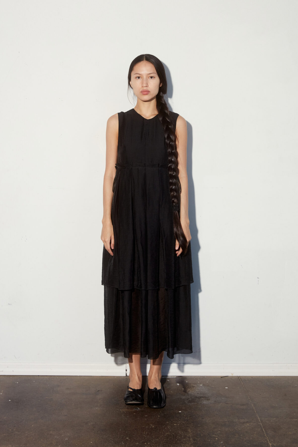 This coat offers a striking silhouette, beautifully tailored with openings to allow movement of the arms, featuring the season’s black basket weave cotton and a pleated detail at the hem.