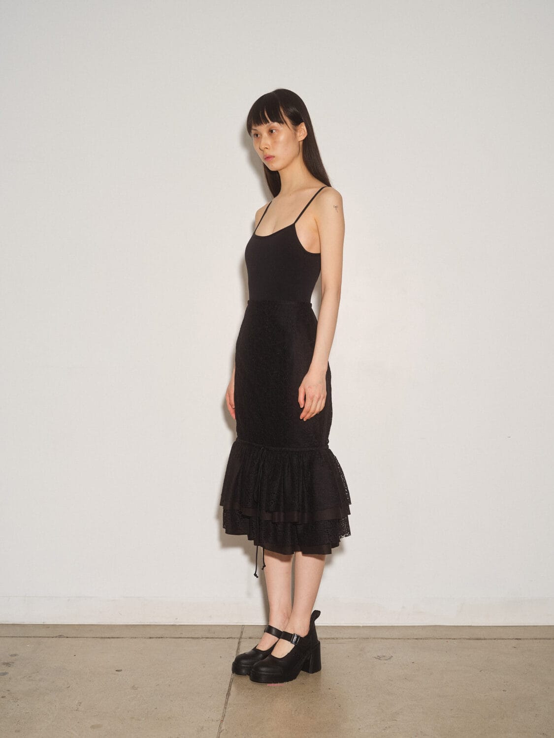 The Carnation Lace Tunnel Tie Ruffle Skirt is hand sewn in New York City.