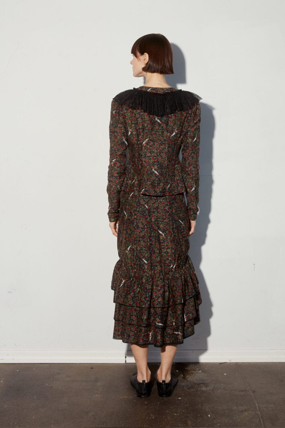 This piece showcases the house’s signature spring | summer 2025 print, a dark floral flecked with ethereal ghost figures.