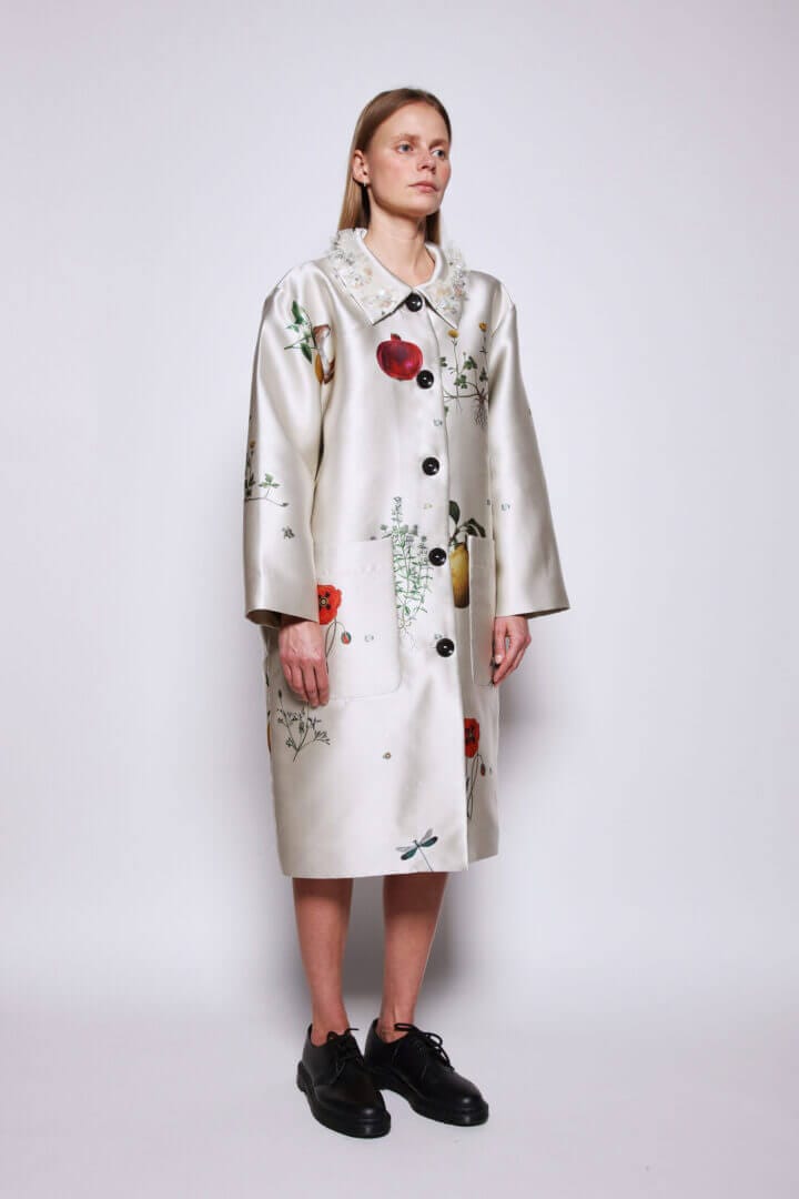 The printed Coat is inspired by the gardens of Meruert’s childhood home in Almaty. Pomegranites roll accross the fabric, and botanicals often seen covering the path. A beautiful concoction of a field spread out onto the satin fabric.